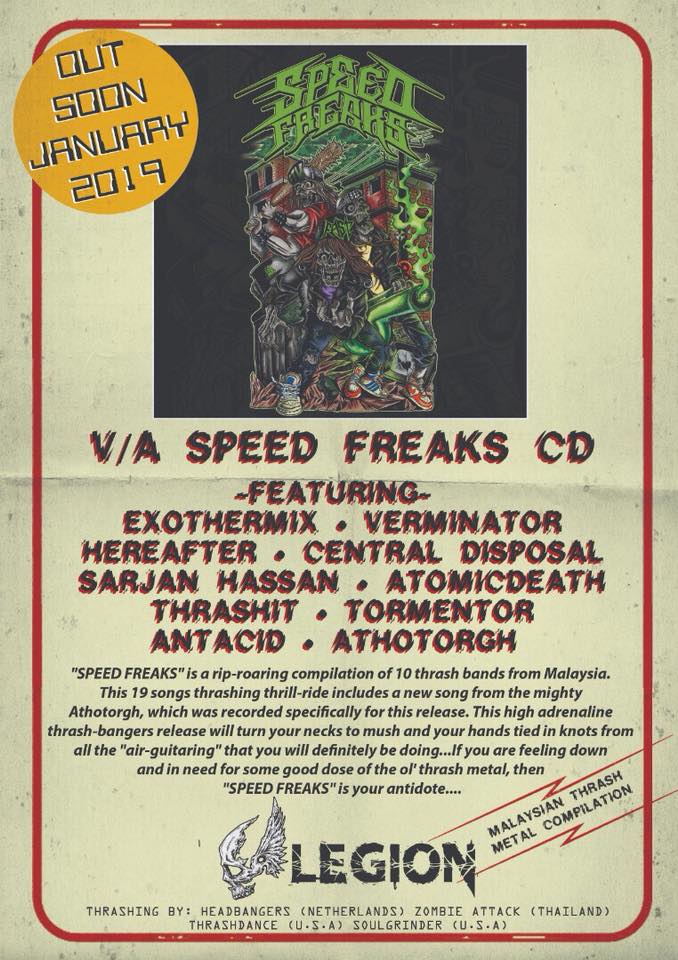 19 track yang tiada lain selain Thrash Metal semata2. Ini adalah antara keluaran terbaek dari Legion Music untuk 2019 walaupun ianya sekadar sebuah kompilasi dari lagu2 terbaek dari release band2 terlibat. Pun begitu penyertaan Athotorgh dengan Necromass Abandon yang merupakan rakaman rasmi khas untuk kompilasi ini merupakan antara buah tangan istimewa dari antara veteren metal scene tanahair. Speed Freaks – Malaysian Thrash Metal Compilation (2019) adalah khas untuk anda yang bergelar mat thrash khususnya. Hahaha..